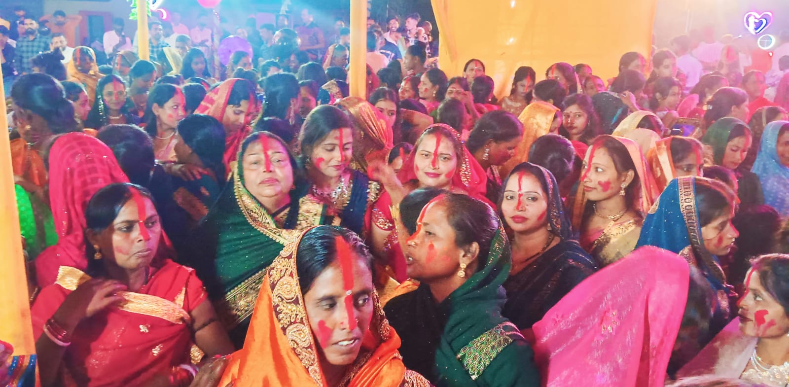 माँ दुर्गा की भावभीनी विदाई की बेला में सिंदूर लगाकर एक दूसरे को सदा सुहागन की शुभकामनाएं देती महिलाएं।